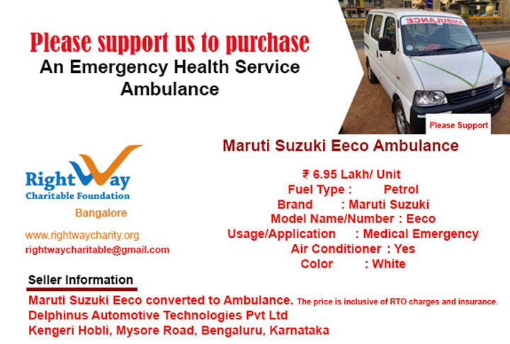 The prime objective of this Emergency Health Response Team is to respond to the emergency and critical health-related issues of the community. In order to achieve this target, we are planning to buy an Ambulance. We saw Maruti Suzuki Eeco Ambulance in Bangalore and Kerala ₹ 695000 x 2 = 13,90,000 The price is inclusive of RTO charges and insurance. The Seller is Delphinus Automotive Technologies Pvt Ltd Kengeri Hobli, Mysore Road, Bengaluru, Karnataka. So we are planning to raise Rs. 14,00,000 to purchase and if there is any works, The Ambulance will be equipped with basic amenities of a health and have the equipment to support the emergency and critical need. We request all well-wishers to come forward and contribute with a great mind so that we Rightway Charitable Foundation can start this operation as soon as possible. Please come forward to support my cause. Any contribution will be of immense help. Do contribute and share this campaign link with your friends and family. Every day we provide 10 x 2 = 20 or more trips which helps save nearly 40000 rupees of financially backward people and the underprivileged community save up to 12 lakhs per month if our ambulance runs continuously